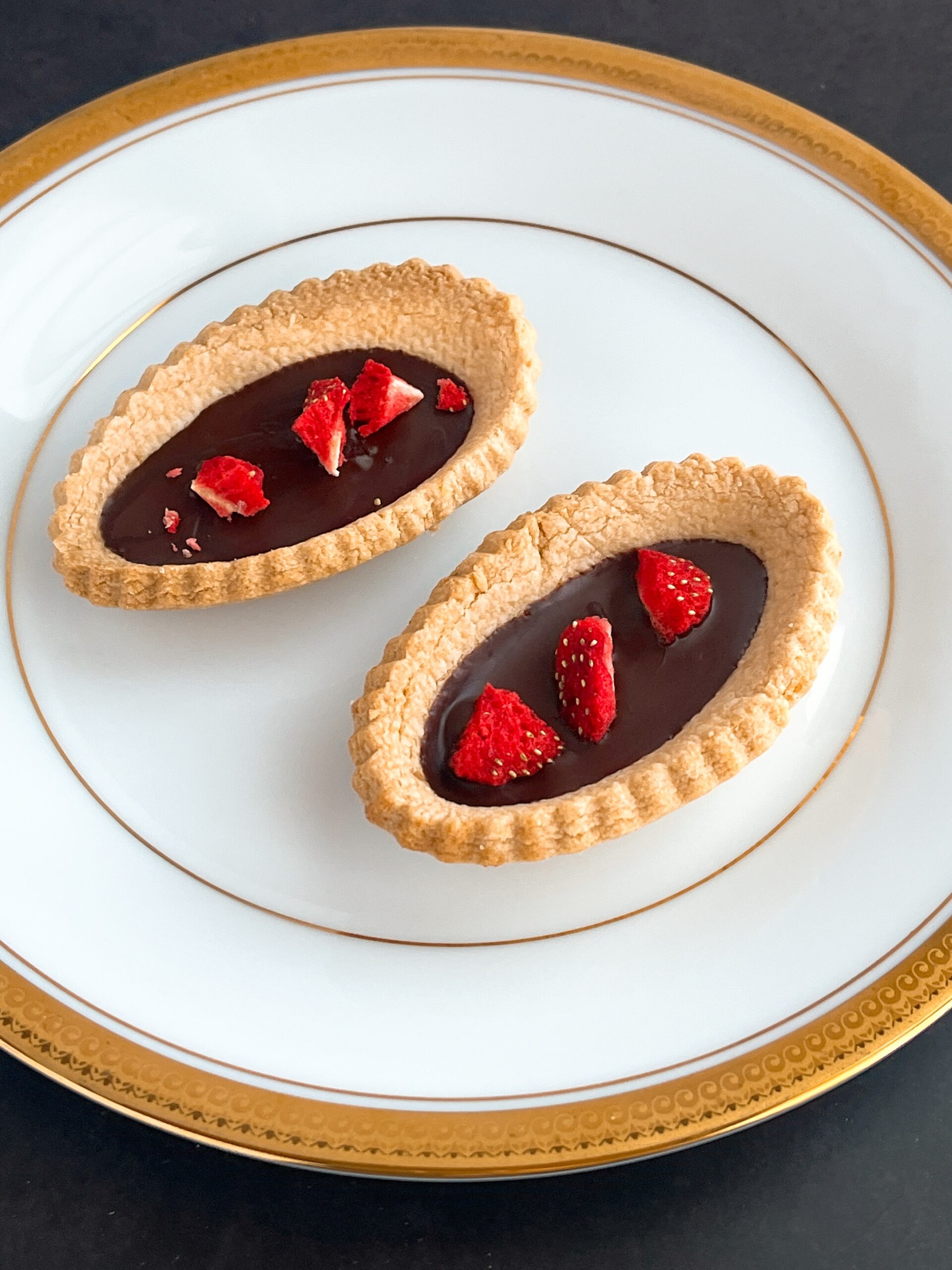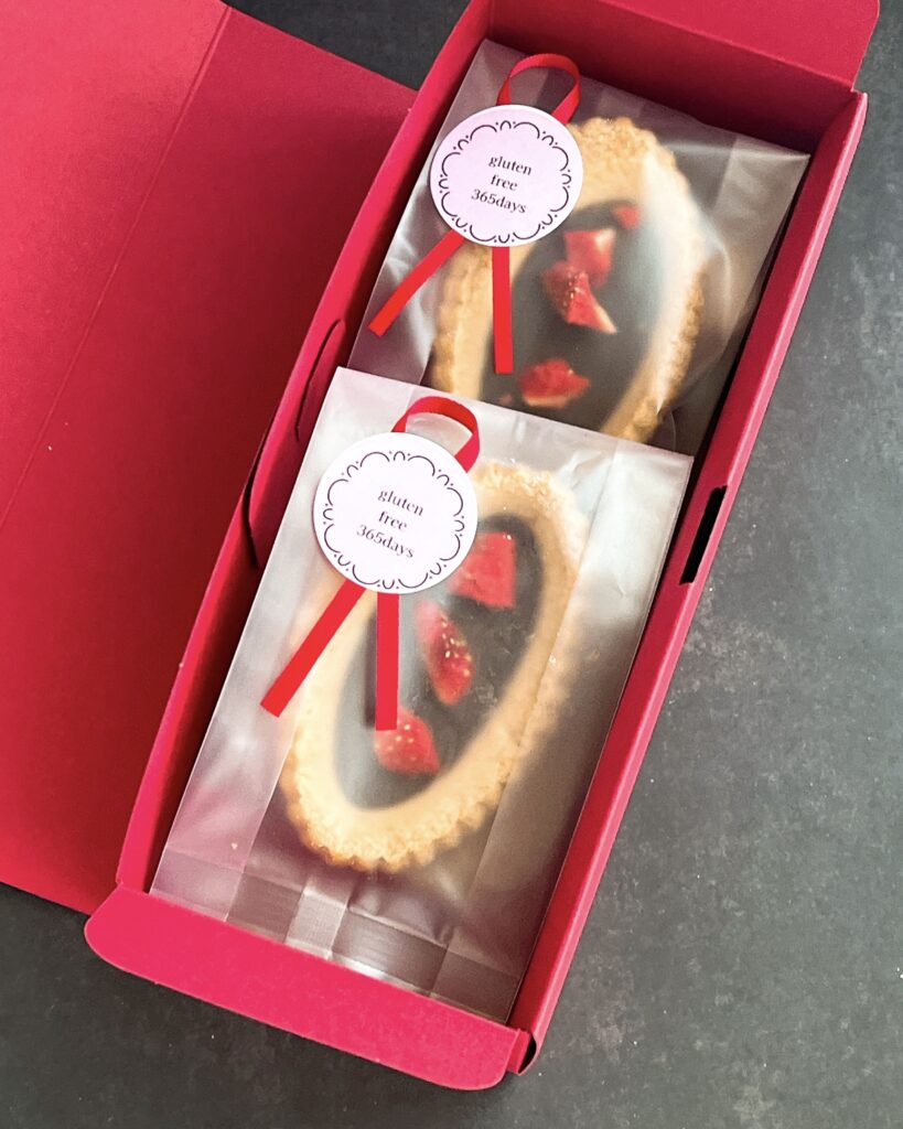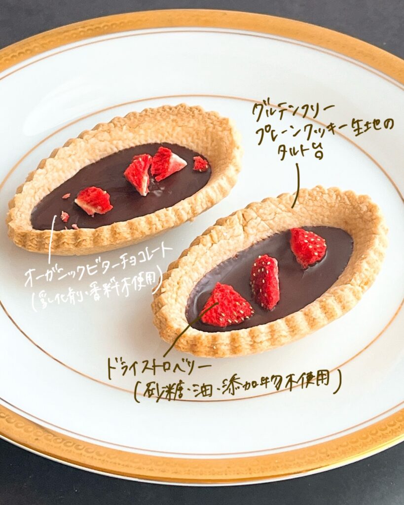 定番のグルテンフリープレーンクッキー生地のタルトに、乳化剤・香料不使用のオーガニックチョコレートと砂糖・油・添加物不使用のドライストロベリーを合わせたプレミアムなグルテンフリーのショコラタルト。