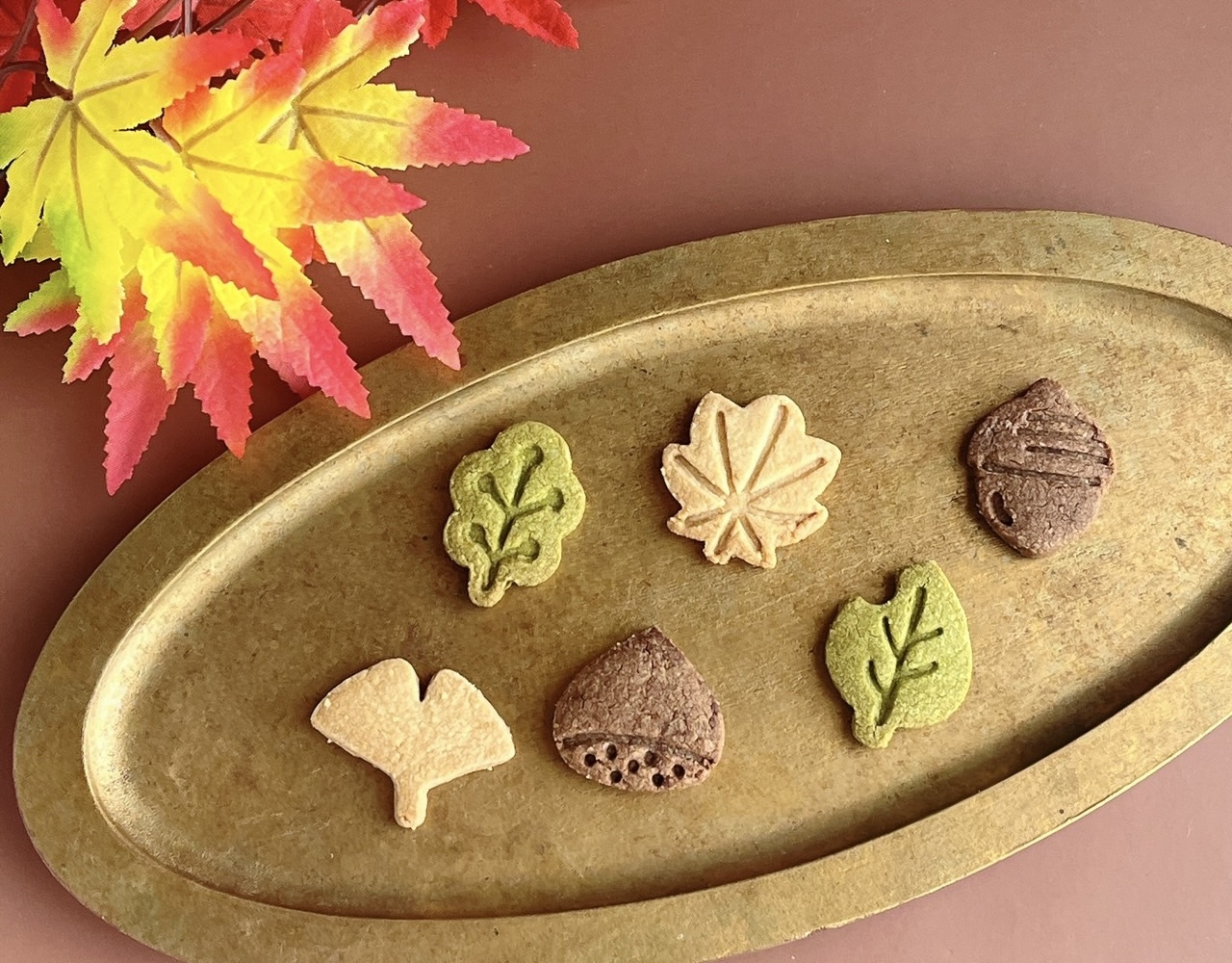 3種類の味をお楽しみいただけるように、もみじ・イチョウはプレーンクッキー、葉っぱの2種類はぐり茶クッキー、栗・どんぐりはショコラクッキーでご用意しました!