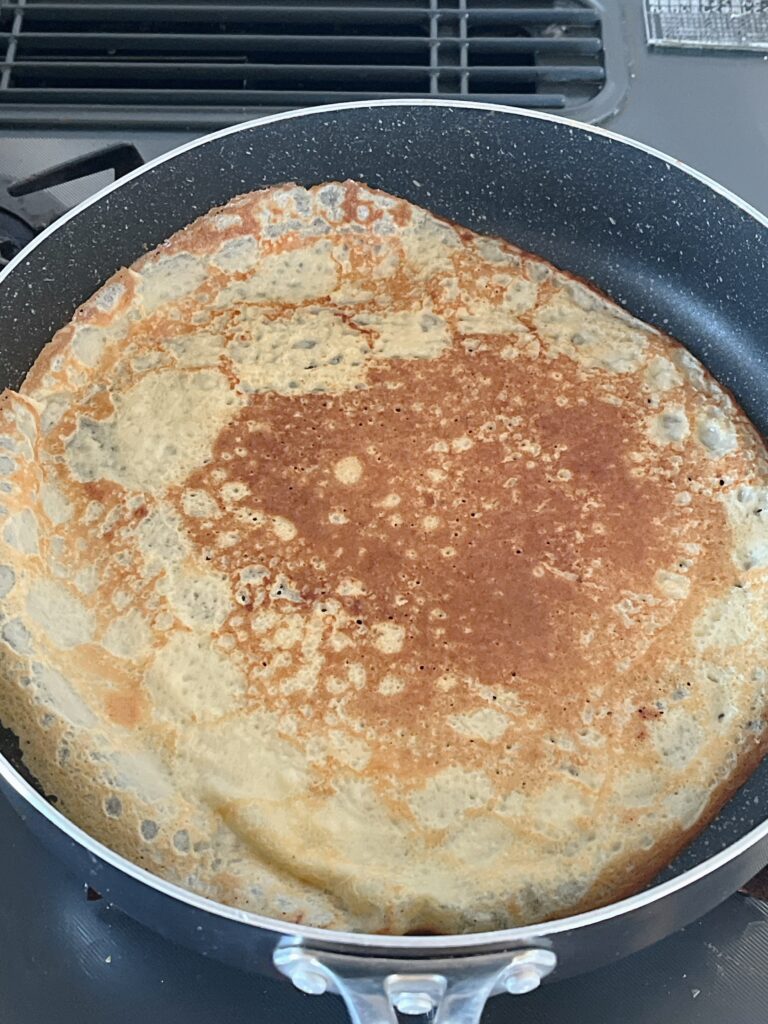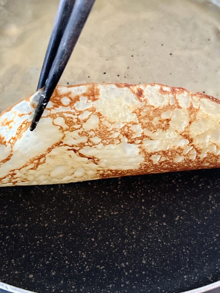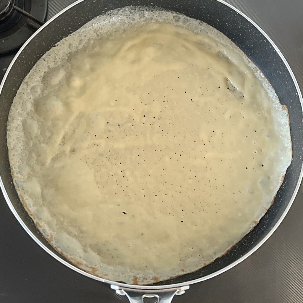 フライパンを中火で熱し、薄く油(分量外)を塗って、生地を入れて薄く広げ、表面が乾くまで焼く。