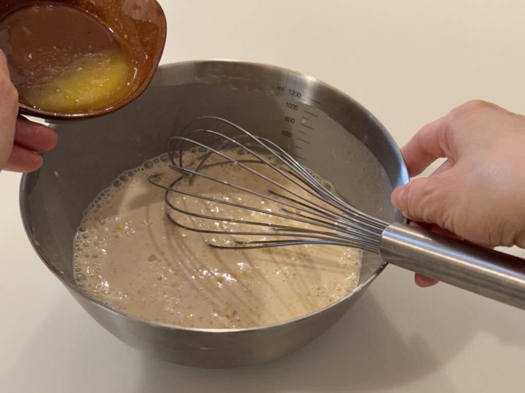 米粉が沈澱しやすいので、生地をよく混ぜから焼くと生地のムラができにくいです。